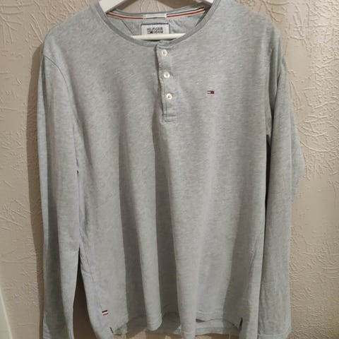Myytävänä Hilfiger- merkkinen miesten pikeepaita. Koko M. Harmaa, jossa farkunsininen kaulus. Slim fit- mallinen. Muuten hyväkuntoinen, mutta molemmissa hihoissa kainalon puolella resorin vieressä pieni reikä (näkyy kuvassa).