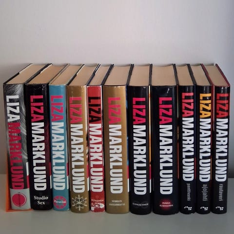 Kaikki kirja kovakantisena. Kuvasta puuttuu Uutispommi kirja, mutta löytyy, jahka muuttolaatikot myllätty.