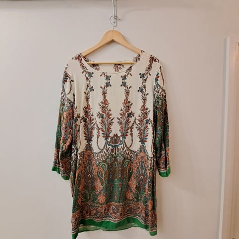 Paisley-kuosinen pitkähihainen lyhythelmainen kesämekko. Vähän 70-luvun tyylinen.