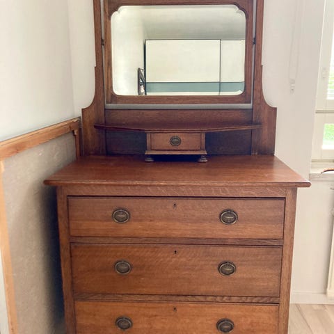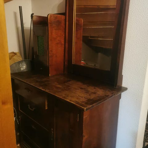 Vanha, koristeellinen, valkoiseksi maalattu, umpipuinen piironki peilillä (fasettihiottu), kaapeilla ja laatikoilla. Kaappien ovet ja laatikot toimivat suhteellisen hyvin. Kulumaa ja patinaa on aikojen saatossa tullut.