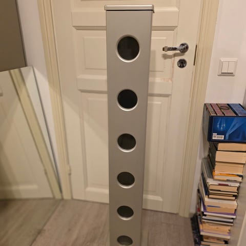 Hyväkuntoinen CD-torni. Pientä kellastumaa sisäpuolella, mutta ei näy ulospäin. Jäänyt itsellä käyttämättömäksi. Jalan syvyys ja leveys 24cm