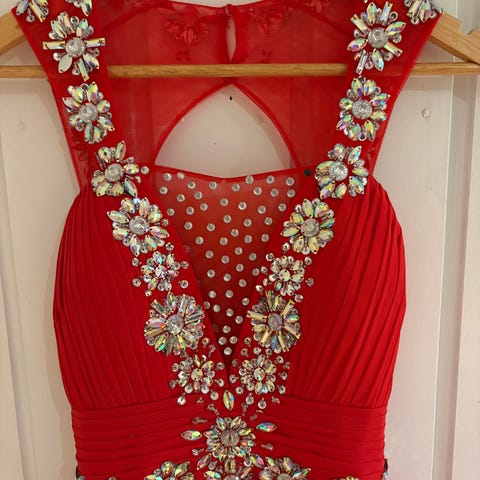 Väri kauniin oranssipunainen ja upea romanttisella vaalealla pitsiosalla ja koristenapeilla tyylitelty vanhojentanssimekko. Koko n. S/M ja hameosan mitta vyötäröltä alareunaan n. 120 cm. Ostettavissa mekon yhteydessä vannehame 25€ jolloin mekosta tulee ihanan pöyheä.