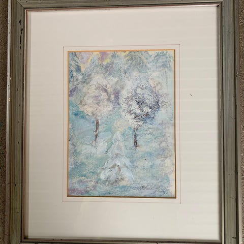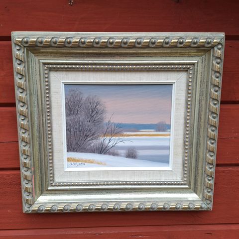 öljypastellityö ”Talvella” vuodelta 1988, kehystetty, lasitettu. Teoksen koko 20x27 cm, kehys 42x49 cm.