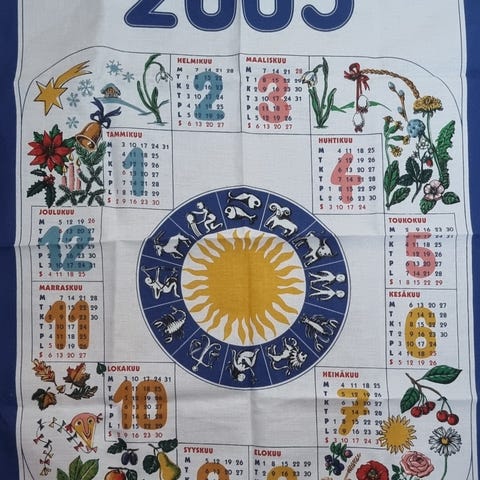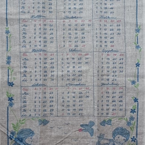 V. 1981 kalenteripyyhe koko 33x56 cm. Juuri pesty, löytyi siis mummon varastoista. Marraskuun kohdalla pieniä nirhaumia, kuvassa 3. Muuten loistavassa kunnossa. Liikun alueella Lahti-Heinola-Mikkeli-Savonlinna-Parikkala tai voin lähettää Toridiilillä tai ilman