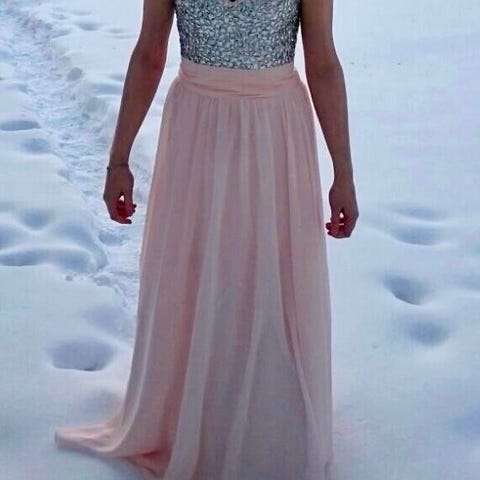 Kaunis vaaleanpunainen vanhojentanssimekko. Koko XS-S. Kauppaan kuuluu mukaan vannehame.