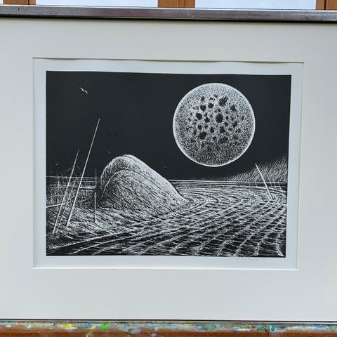Veikko Takalan sekatekniikkatyö Lakeus vuodelta 1982. Teos 23x36 cm, kehys 45x58 cm, mattalasi.