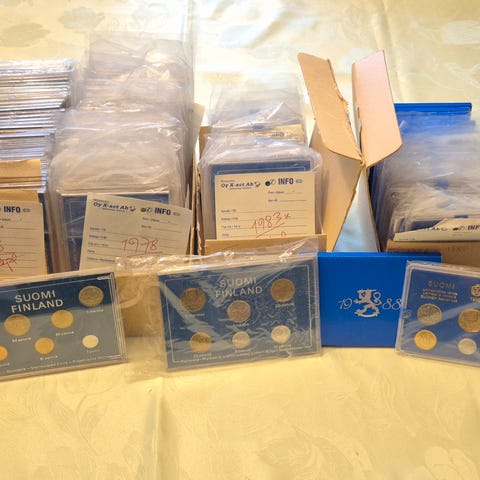 Avaamaton laatikko 10kpl Suomi-Ruotsi 1990 rahasarjakoteloita sisältäen rahat 5mk-5p (hinta