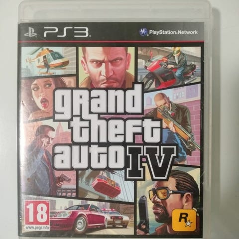 Rockstar Games Grand Theft Auto IV Playstation 3 peli. Ikärajasuositus 18+, peli sisältää avoimen maailman toimintaseikkailun Liberty Cityssä. Pelin kansi ja kotelo näkyvät kuvissa.