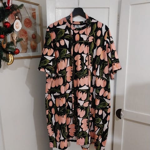 Papun hyväkuntoinen mekko, oversize malli, 2/3 hihat. Ei moitittavaa kunnossa. Beige pohja, värikkäät kuviot. Kai-kai 80cm ja olka-helma 105cm. Toridiilillä, normi postitettuna tai noutona