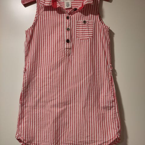 Kaksi hyväkuntoista mekkoa, kokoa 128. Hajusteeton ja eläimetön koti.