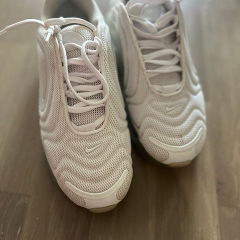 Siistit, käytetyt Nike Air Maxit kokoa 36,5. Kantapäät ehjät. Vasemman kengän reunassa, ylimpien nauhoitusreikien yläpuolella, kengän sisäpuolella kangas kulunut puhki (kuva).