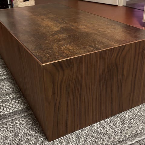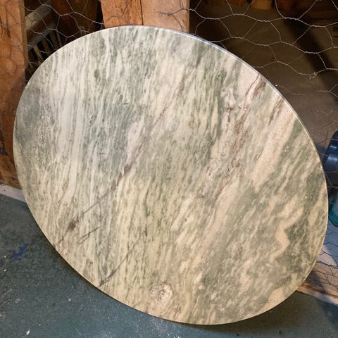 Pöydän materiaali on kuparia, missä nyt ajanpatinaa. Pöydän voi kiillottaa, jolloin saa alkuperäisen kuparin hehkun takaisin. Olen sen kerran vuosia sitten kiillottanut, mutta se on jälleen patinoitunut. Pöytä on pesty ohjeiden mukaan miedolla pesuaineella.