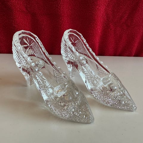 Ihana koristettu lasi korkokenkä noin 14,5 cm korkea,noin 14 x 5 cm leveä.Etuosa rikki, kuvassa nähdä.