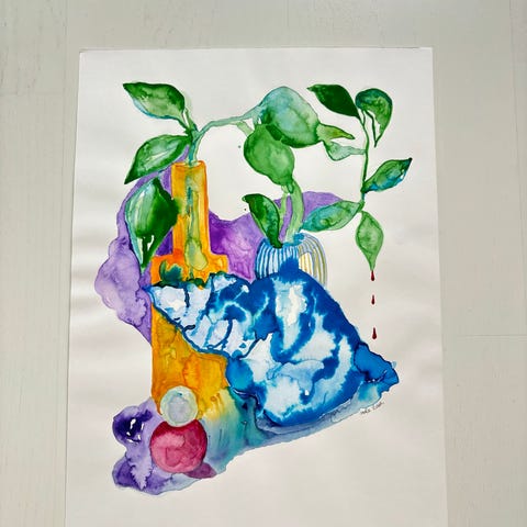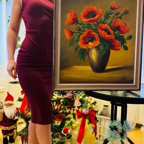 Kehystetty tunnelmallinen maalaus unikkoja maljakossa. Koko noin 60x70cm. Kunto moitteeton.