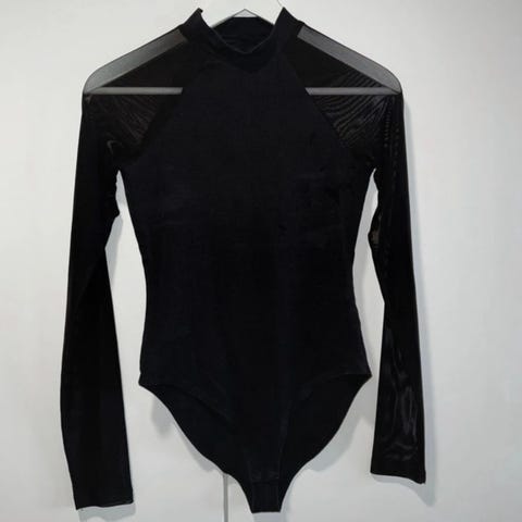 Musta cold shoulder paita, kunnoltaan kuin uusi. Toinen kuva lähikuva paidan materiaalista.