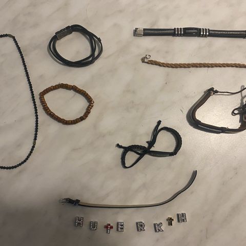 Joustavat kevyet rannekorut 4kpl/ 5€ ja nahka-, kivi- ja helmirannekorut 3kpl/ 8€.