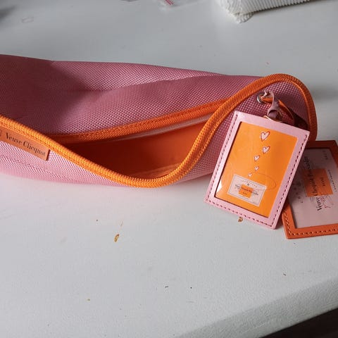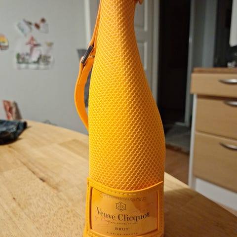 Veuve Clicquot samppanjapullon ”takki” toimii coolerina ja koristeena. Tuote on uutta vastaava, vetoketjulla suljettava. Korkeus n. 29cm ja halkaisija pohjasta 9,5cm.