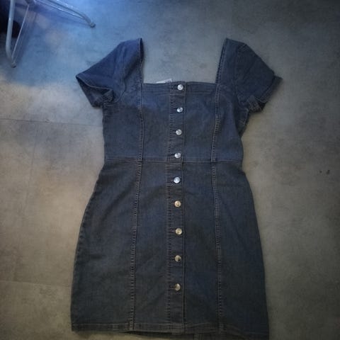 Uusi upea farkkumekko, laputkin vielä paikallaan. Joustavaa farkkukangasta, vartalonmyötäinen malli. Edessä koko matkalla napitus ja rinnan seutu kauniisti ommeltu, helmasta lyhyen mallinen mekko.