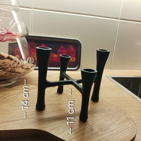 Kynttelikkö on kookas 50 cm korkea ja 35 cm leveä, takorautainen ja viisihaarainen.