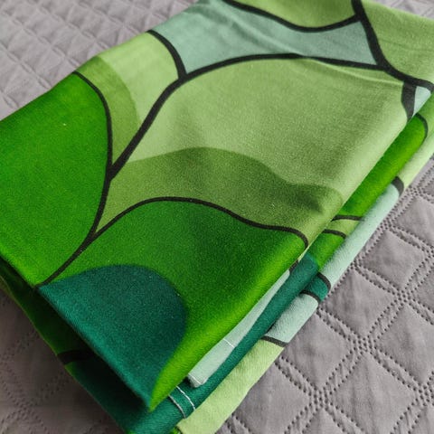 Design Marjatta Metsovaara, Tampella. Paksua satiinipuuvillaa. Ommeltu itse tyynynpäälliseksi, jonka mitat on 54x62 cm. Kankaan värit säilyneet hienosti.