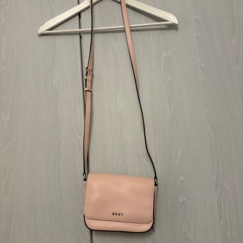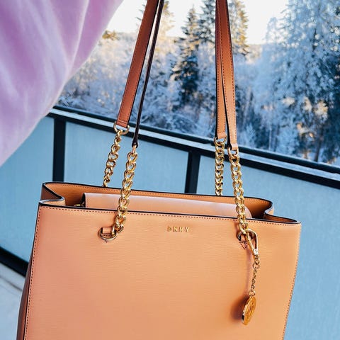 DKNY uusi tekonahkainen naisten olkalaukku, jossa musta ja harmaa väritys ja ketjuhihna. Laukussa on useita lokeroita ja vetoketjutasku sisällä.