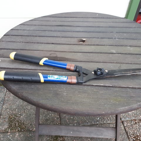 Käyttämättömät puutarhasakset teleskooppikahvoilla perennojen ja pensaiden leikkuuseen.