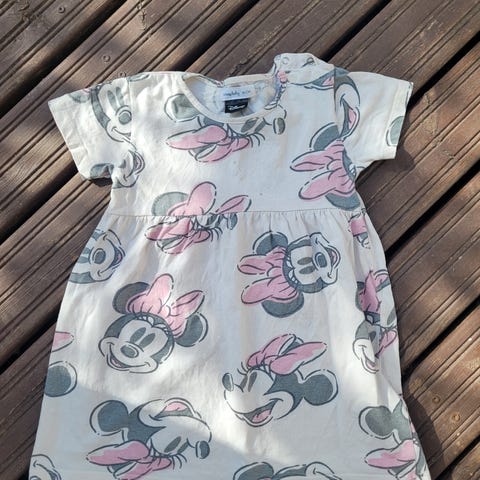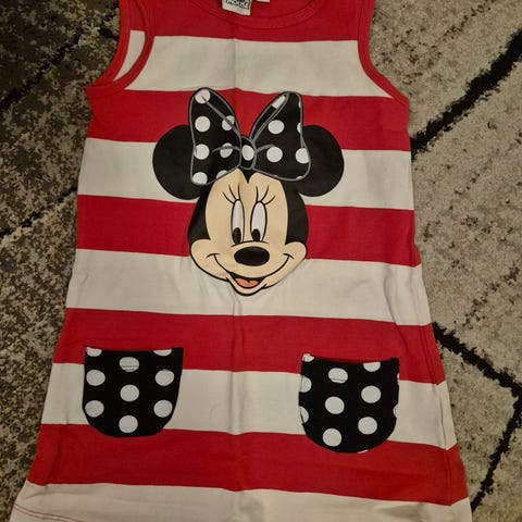 Hyvässä kunnossa oleva Minnie Hiiri mekko hupulla. Edessä vetoketju.