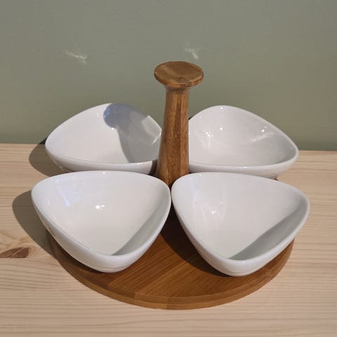 Kaksi puista tarjoiluastiaa. Suuremman halkaisija n. 13 cm ja pienen n. 10 cm. Korkeus 7 cm.