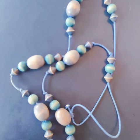 Aarikan vintage puuhelmet / kaulakoru. Väri sininen ja hopea. Säädettävä pituus. Erinomainen vintage kunto. Postitus sisältyy hintaan.