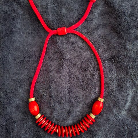 Aarikan vintage puuhelmet / kaulakoru. Väri punainen ja hopea. Erinomainen vintage kunto.