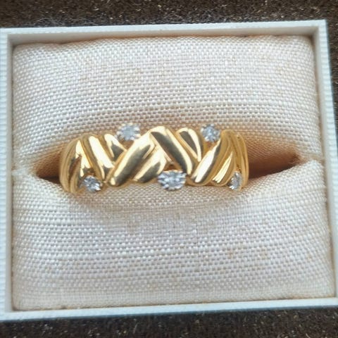Kultainen sormus timantilla. 14 karaatin kultaa (leima, kuva). Käytetty, eli kaipailee käyntiä kultasepällä. Ovh. 999€ ostaessa. Halkaisija n. 16,9 mm. Vikassa kuvassa sormus työntömitassa-mitat näkyy siinä vielä.