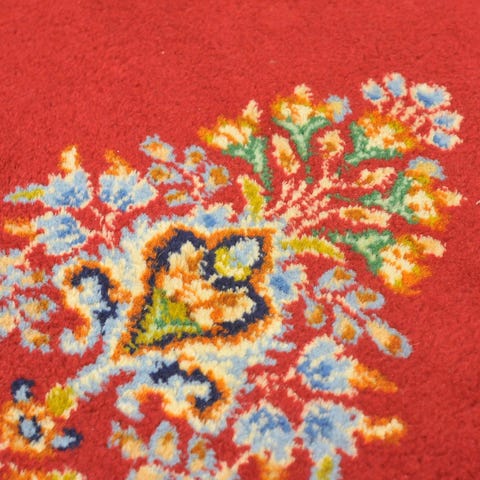 Kunto: Erittäin hyvä. Ehjä ja tahraton. Vain vähäistä käyttökulumaa. Kirkkaat haalistumattomat värit. Pienellä alalla näkyvä värin vaihtelu (katso lähikuva) johtunee siitä, että mattoa on jossain vaiheessa korjattu.