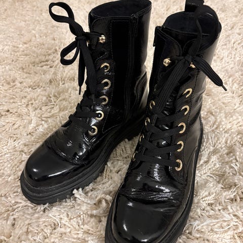 Kiomin mustat nilkkurit kiiltonahkaa. Näitä käytetty kerran, eivät sopineetkaan omaan jalkaan. Alkuperäinen laatikko ei enää tallessa.