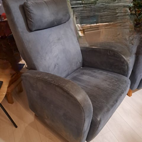 Tumman harmaata kangasta. Pystyasennossa keinuva. Ollut vähällä käytöllä, ehjä ja siisti. Syvyys makuuasennossa 174 cm.