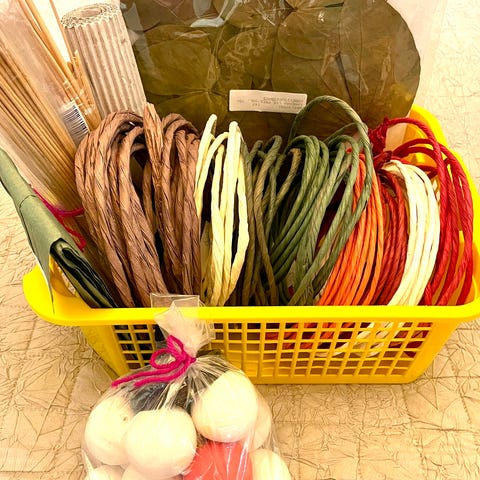Silkkipaperit 5 x 5/kpl pakkaus, oikeassa reunassa kreppipaperit ja kukkateippirulla, edessä paksua paperinarua osa avattu. Toisessa kuvassa, lisäsin vielä 2 pkt silkkipapereita