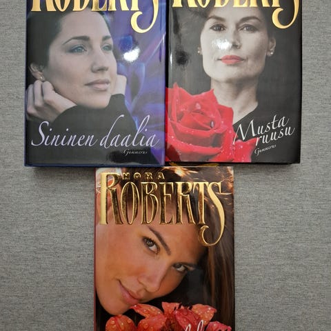 Muutama Robertsin harlekiinitrilogia hyväkuntoisina pokkareina.