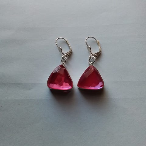Kauniit korvakorut vaaleanpunaisilla korukivillä, ovat viistohiotut jolloin korun pinnasta tulee elävä ja kauniisti sädehtivä, pituus koukun kanssa 4,5cm. 925-leimatut.