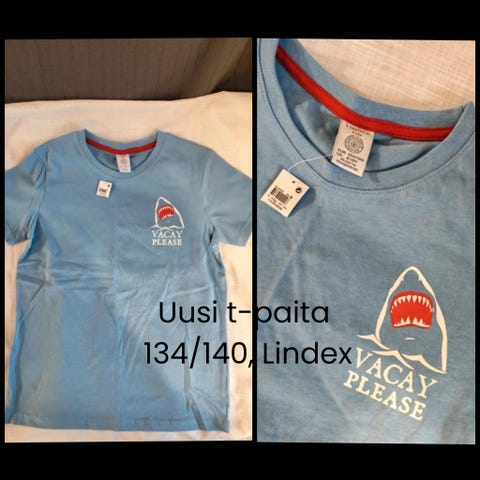 Lindex Holly&Whyte meleerattu harmaa latikkomallinen t-paita, jossa kultainen Eiffel-torni, koira ja ilmapalloja. Kokolappu irronnut, mutta muistaakseni 134/140. 50% puuvillaa, 50% modaalia. Ohut ja pehmeä. Ihan pientä kulumaa koiran mahassa, kuvio muuten kunnossa. Vähän hahtuvaa pinnassa (ei pomppaa silmille), kuvatessa huomasin pienen ratkeaman kauluksen reunassa, muuten ehjä ja siisti. Savuton ja karvaton koti, hajusteeton pesu.