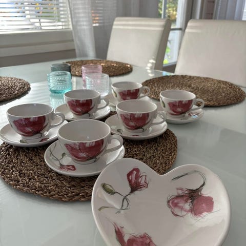 Huom. Myydään kokonaisena astiasarjana. Ei yksitellen. Kupit virheettömässä kunnossa, lautasissa ja kulhoissa hyvin hentoja käytönjälkiä. Mieluiten nouto.