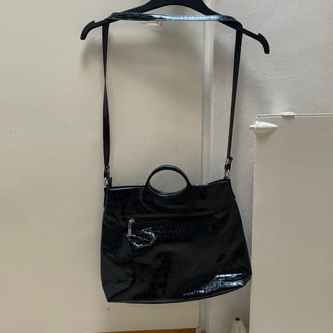 Pieni musta nahkalaukku hihnalla. Laukussa on useita lokeroita yhdessä vetoketju. Mukana säilytyspussi.