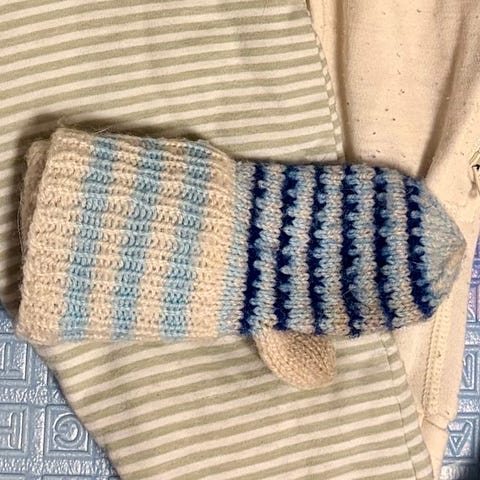 Itse kudotut lapaset 2kpl, valkeat ja siniset, ei peukaloa.