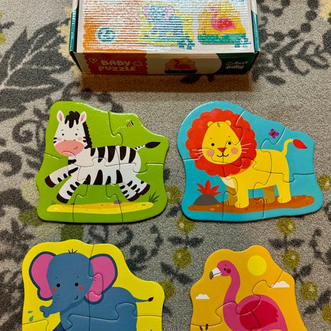 Liikennevälineitä ja maatilan eläimiä sisältävä laatikollinen kaksipalaisia palapelejä. Ikäsuositus +18kk, lapsesta riippuen saattaa mennä jo vuosikkaasta. Lisänä yksi Liberon palapeli. Osat ovat aikalailla siistissä kunnossa vaikka tehty jo monen monta kertaa usean lapsen voimin!