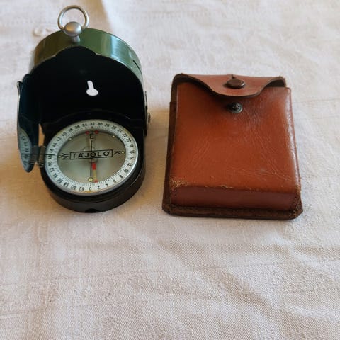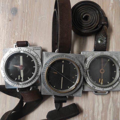 Kuvan mukainen kompassi. Tämä kompassi on tietojeni mukaan irroitettu toisessa maailmansodassa alas ammutusta Neuvostoliittolaisesta lentokoneesta. Näin minulle kertoi kompassin sodassa ihan itse irrottanut mies, josta aika jo jättänyt. Hän piti tätä veneessä kompassina ja kun ostin hänen veneen, siirtyi kompassi minulle. Enempää en osaa tuosta sanoa. Pimeässä kompassin lukemat hohtavat.
