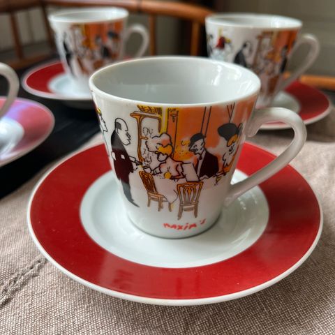 Kauniit kahvikupit suklaa-aiheisilla kuvilla ja ranskankielisillä teksteillä. Painatus on molemmilla puolilla kuppia. Neljän kappaleen setti. Laadukas posliini, merkki Cypress Homme.