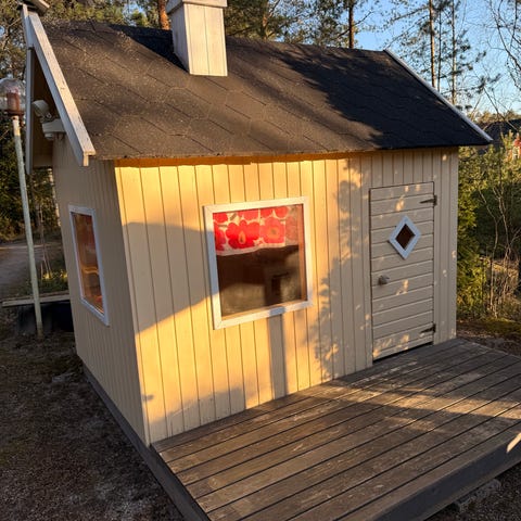 Aika tilaava,ehjä kaikin puolin leikkimökki.Osaava kaveri voi muuttaa sen vaikka pihasaunaksi,taukotilaksi,tai koirankopiksi....mökki sijaitsee takapihalla,kantomatkaa tielle noin 30 metriä,6 henkilöä voi sen nostaa ja viedä tielle,missä sen voi nostaa kyytiin.Hirvikoski ,Loimaa watsapp :0469697129