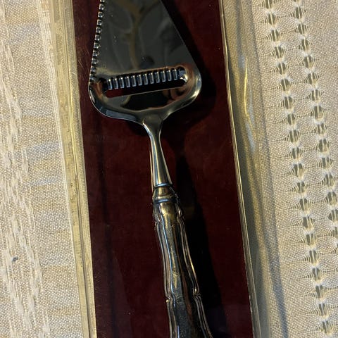 Chippendale -sarjan juustohöylä. Ehjä, liki käyttämätön. Parempi puhdistus/kiillotus jää ostajalle.