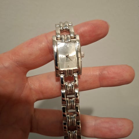 Rintakello , valkoinen kellotaulu, metallinen ketju ja kiinnike. Sopii käytettäväksi työvaatteissa tai lisävarusteena. Helppo kiinnittää ja irrottaa. Patteri vaihdettu.