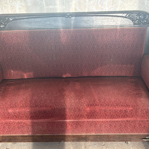 1x sohva, 2x nojatuoli ja sohvapöytä. Ikäänsä nähden sohvaryhmä ja pöytä ovat varsin hyvässä kunnossa, vaikka käytön jälkiä näkyykin. Kalusteet olleet lemmikittömässä taloudessa eli ei kynsimisen jälkiä yms. Tarvittaessa voimme kuljettaa kaluston noutoa varten Maskuun.