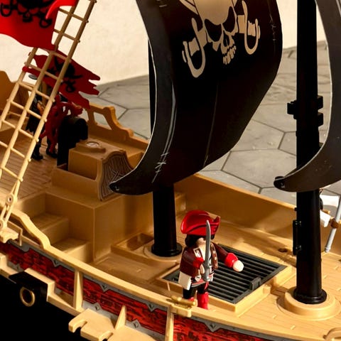 Tästä playmobilen merirosvolaiva ja sheriffin toimisto/vankityrmä suoraan ysärin alusta! Ajanpatinaa ja kulumaa löytyy ja muutamia osia hukuksissa tai mennyt rikki. Hyvät leikit silti varmasti saa ja aina voi soveltaa tai korjata. Kaikki ukkelit toimivia ja laiva käytännössä purjeiden kiinnitystä vaille valmis. Vankilan sellin kalteri ei pysy ilman sinitarraa pystyssä ja takaseinät puuttuvat osittain. Pikaliimaa löytyy parista kohtaa ja ne lähtee raaputtamalla pois. Sheriffille löytyi vielä hattu ja merirosvolaivaan aarrearkku, sekä aseita miehistölle ym. Voin myöhemmin vielä infota mikäli jotain osia löytyy.
