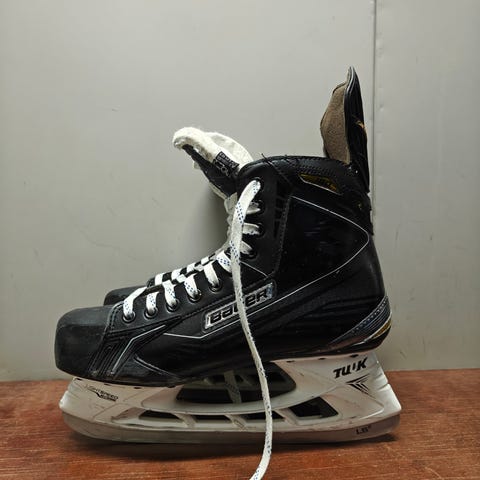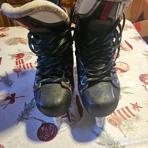 Bauerin luistimet. Aktiivikäytössä olleet, joten ulkopuolella osuman jälkiä on. Mutta edelleen jämäkät luistimet, koko 38,5. Pohjallisen koko 25cm.
